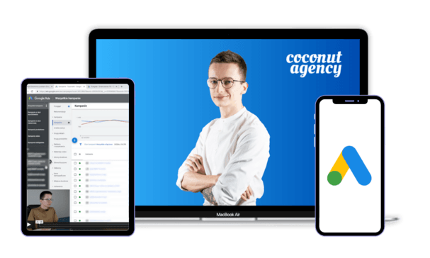 Kurs zawiera m.in. nagrania ekranu i praktycznej konfiguracji kampanii w panelu reklamowym Google Ads.