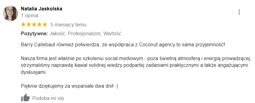 No potrafią w te marketingi, potrafią... ;) Jako zadowolony klient polecam usługi Coconutów w zakresie obsługi social mediów oraz realizacji działań marketingowych. Mają rozsądne ceny, bardzo dobrą jakość obsługi, szybki kontakt. Można liczyć na realizację bieżących projektów oraz wsparcie w planowaniu strategii marketingowej.