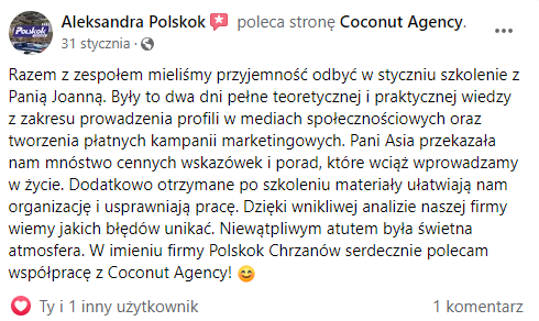 Nie ulega wątpliwości, że specjaliści Coconut Agency posiadają ogromną wiedzę z zakresu mediów społecznościowych i skutecznie używają jej, planując efektywne działania. Jesteśmy bardzo zadowoleni z usług agencji, a także ze sprawnego i owocnego kontaktu z nią. Z pełnym zaufaniem rekomenduję Coconut Agency jako rzetelnego partnera w promocji marek w mediach społecznościowych. Z poważaniem,
